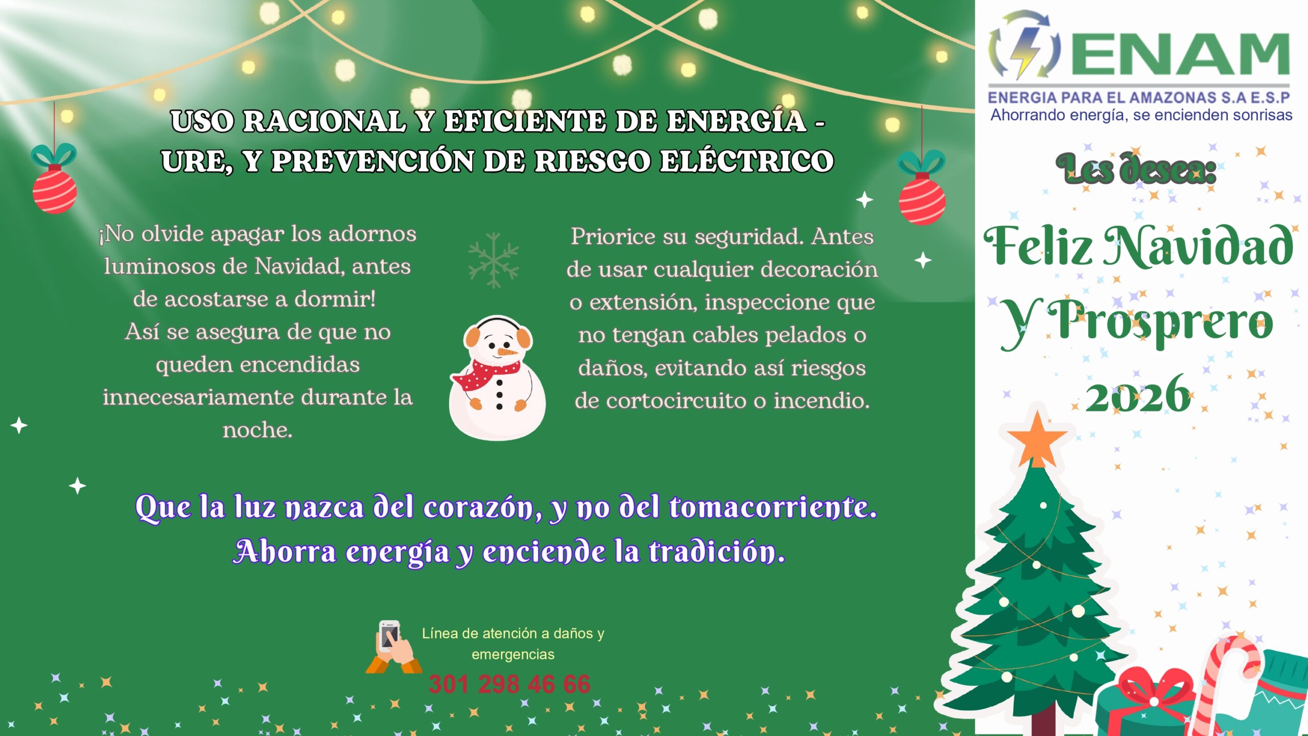 ENAM con el fin de prevenir, minimizar o eliminar los riesgos de origen eléctrico, lleva a cabo las capacitaciones sobre el uso racional y eficiente de energía, y la prevención de riesgo eléctrico en los dos municipios del departamento del Amazonas, y en las localidades menores situadas en las riberas del Amazonas, Caquetá y Putumayo, que hacen parte del contrato de Concesión, basándose en la Resolución 90708 del 30 de agosto de 2013 que tiene como objetivo garantizar la seguridad de las personas, la vida animal y vegetal, y la preservación del medio ambiente.