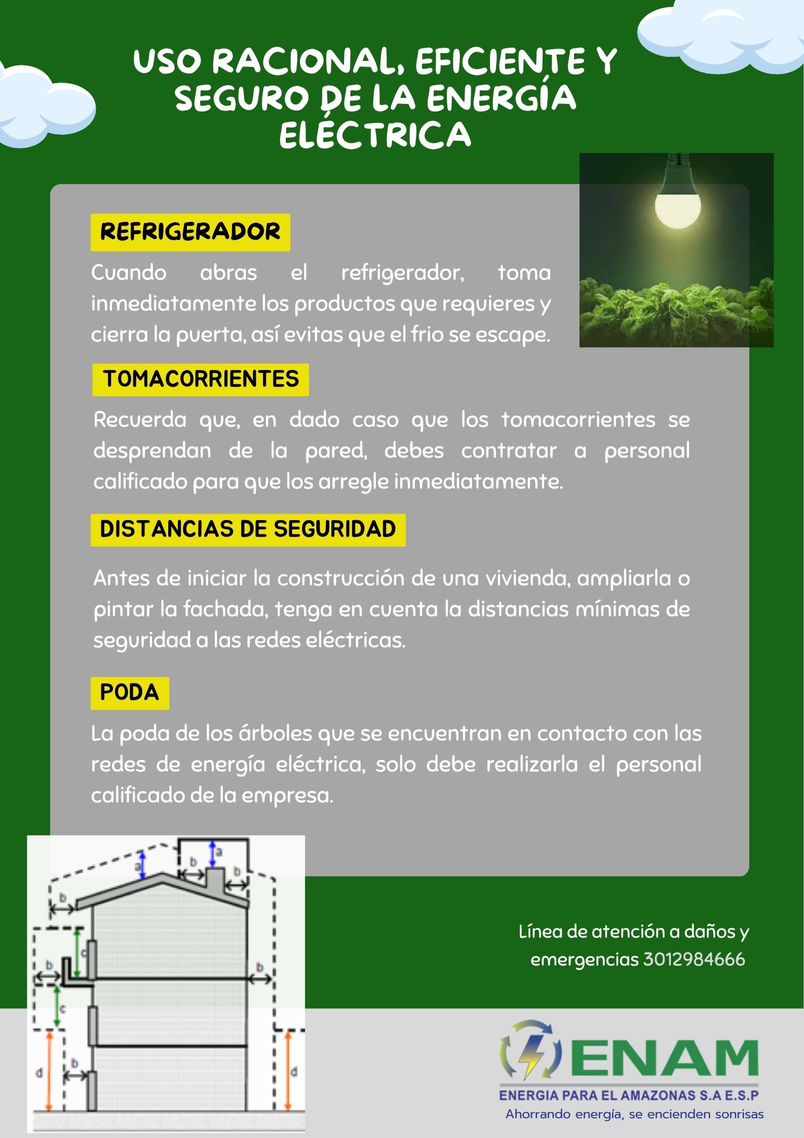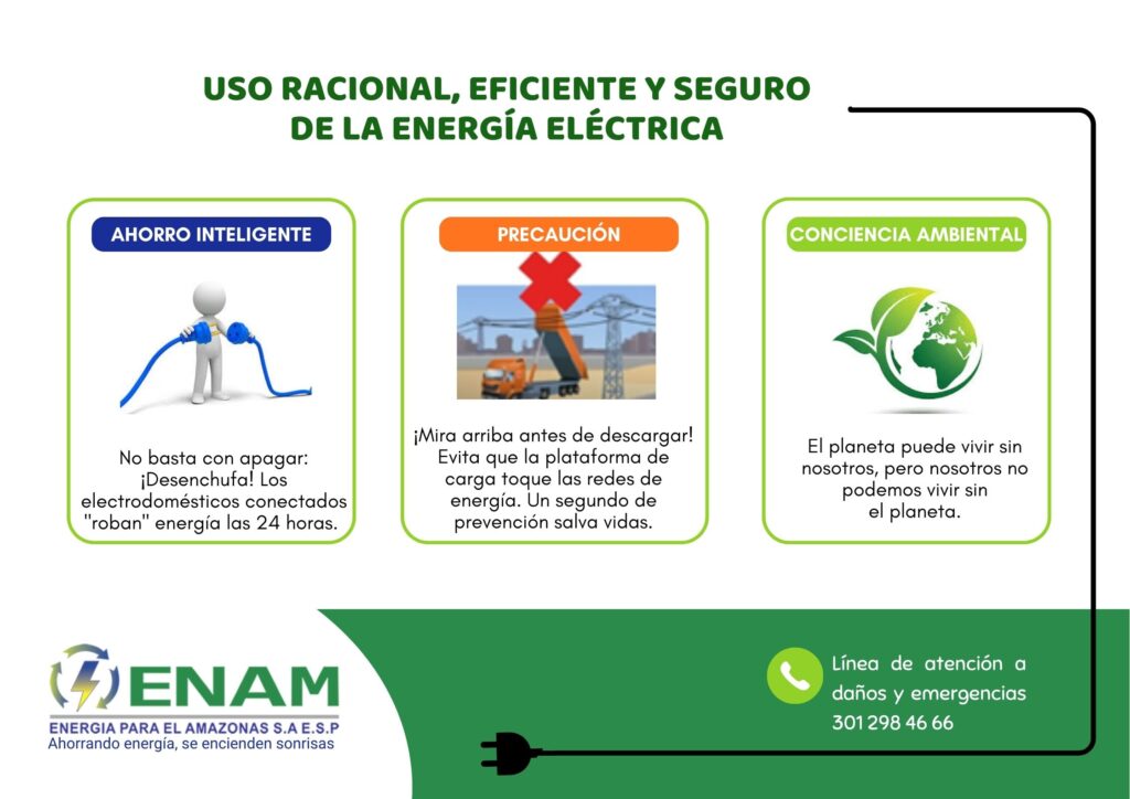ENAM con el fin de prevenir, minimizar o eliminar los riesgos de origen eléctrico, lleva a cabo las capacitaciones sobre el uso racional y eficiente de energía, y la prevención de riesgo eléctrico en los dos municipios del departamento del Amazonas, y en las localidades menores  situadas en las riberas del Amazonas, Caquetá y Putumayo, que hacen parte del contrato de Concesión, basándose en la Resolución 90708 del 30 de agosto de 2013 que tiene como objetivo garantizar la seguridad de las personas, la vida animal y vegetal, y la preservación del medio ambiente.